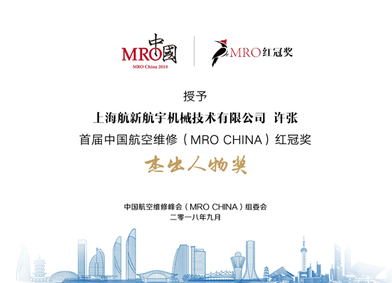 [喜報(bào)]上海航新許張榮獲首屆中國(guó)航空維修(MRO CHINA)紅冠獎(jiǎng)之“杰出人物獎(jiǎng)”