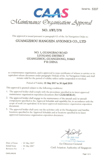 審查結(jié)束后,航新電子按時(shí)對(duì)新加坡民航局審核組提出的不合格項(xiàng)進(jìn)行整改,新加坡民航局審核組認(rèn)可航新電子的整改措施后,在2017年5月份給我司頒發(fā)了SAR-145維修許可證。