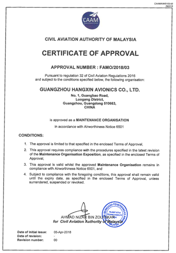 近期,航新科技旗下子公司廣州航新電子有限公司(簡稱:航新電子)獲得馬來西亞適航局頒發(fā)的馬來西亞適航維修許可證書。在亞太地區(qū)繼印尼、泰國、越南、孟加拉、新加坡等國后又增加一個國外適航維修許可證。這將有助于航新科技增強(qiáng)整體競爭力,拓展國外部件維修市場。
