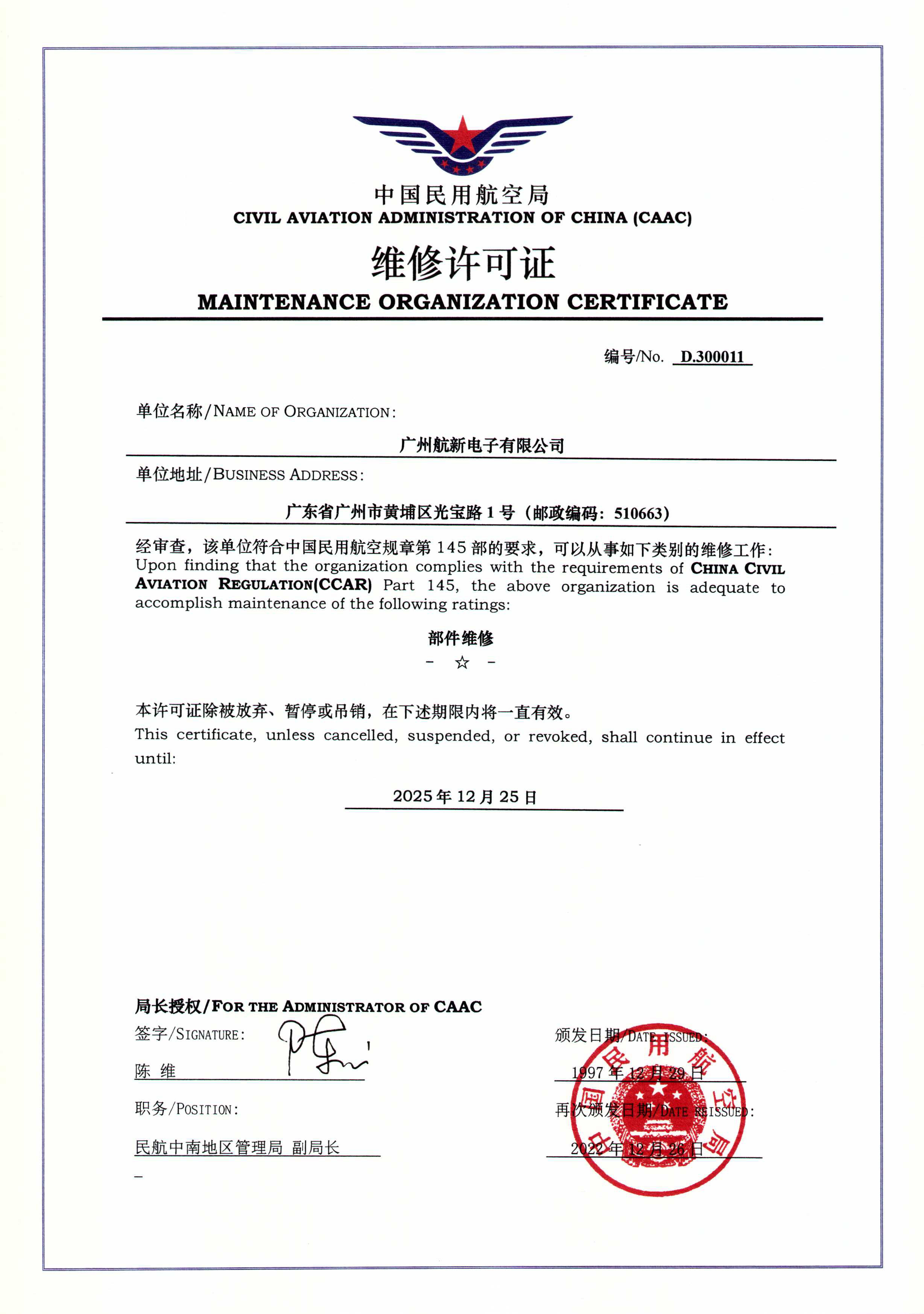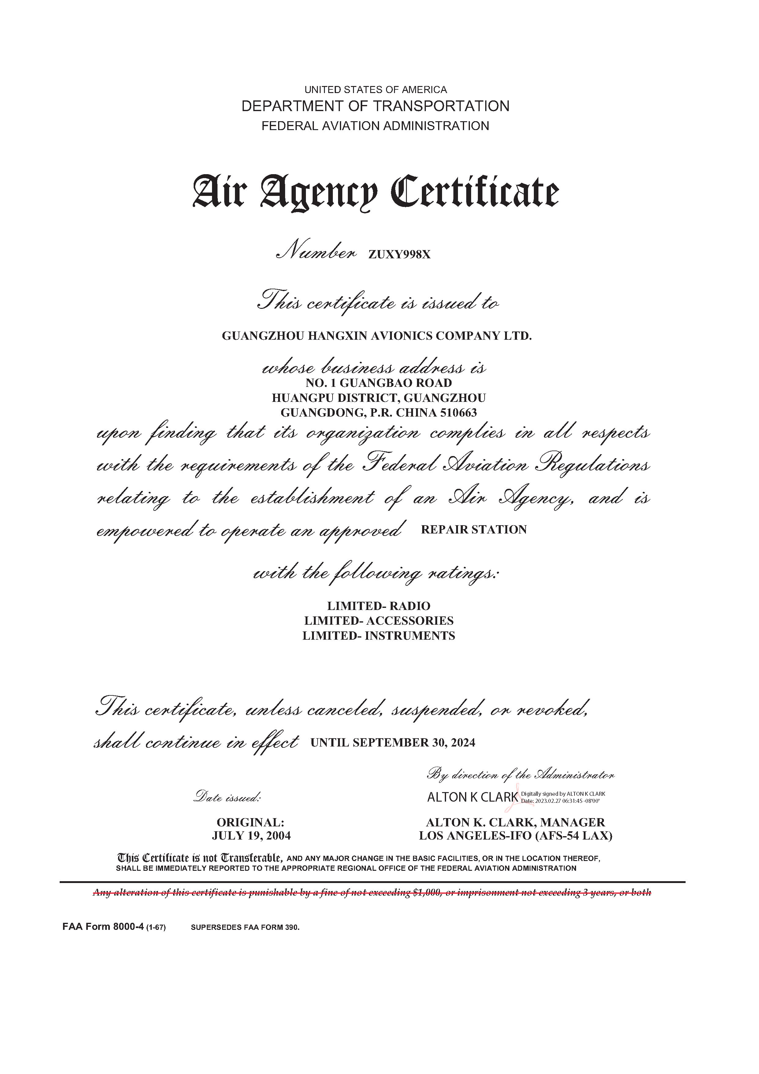 FAA維修許可證(廣州航新)
