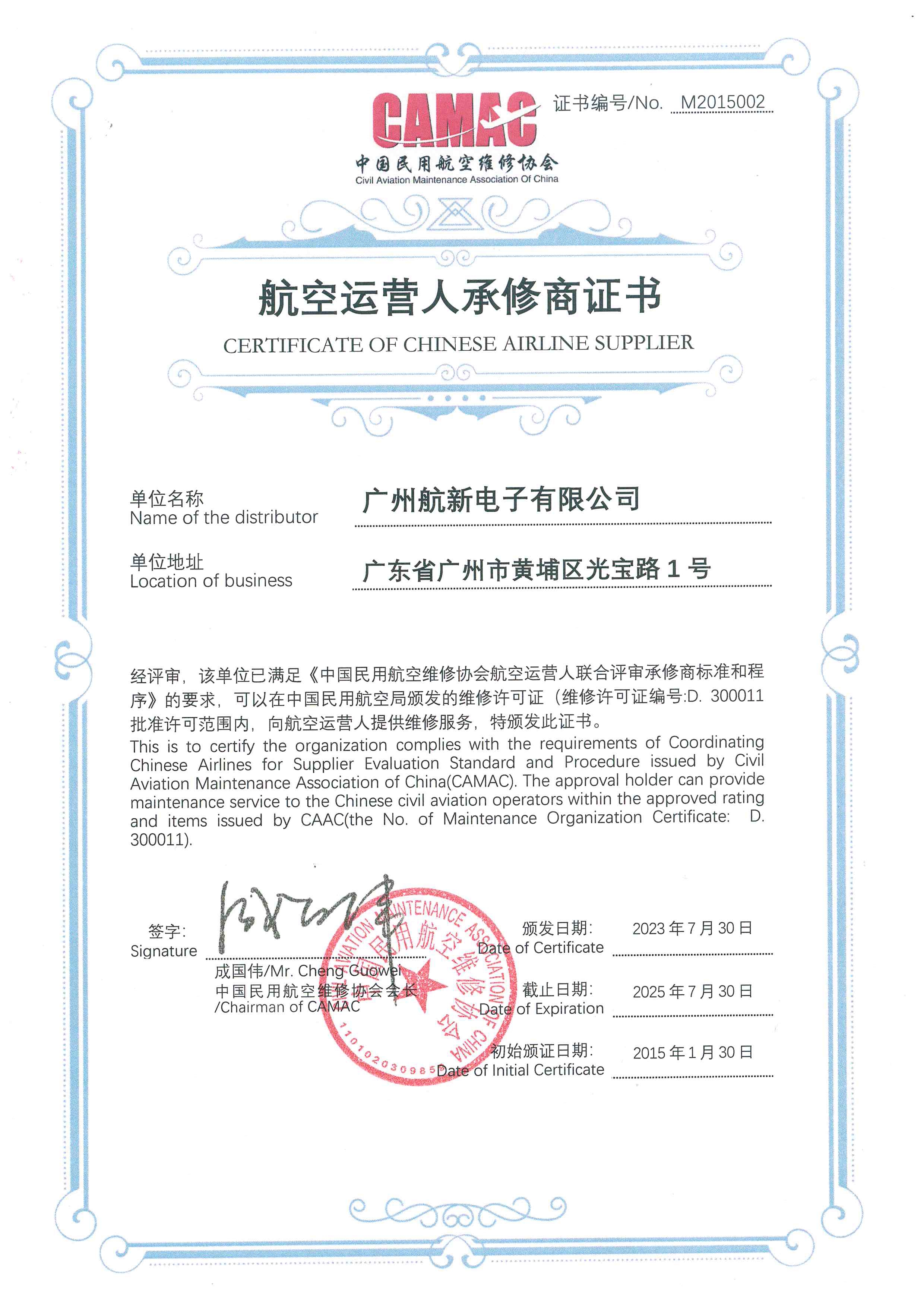 航材分銷商證書(航新電子)