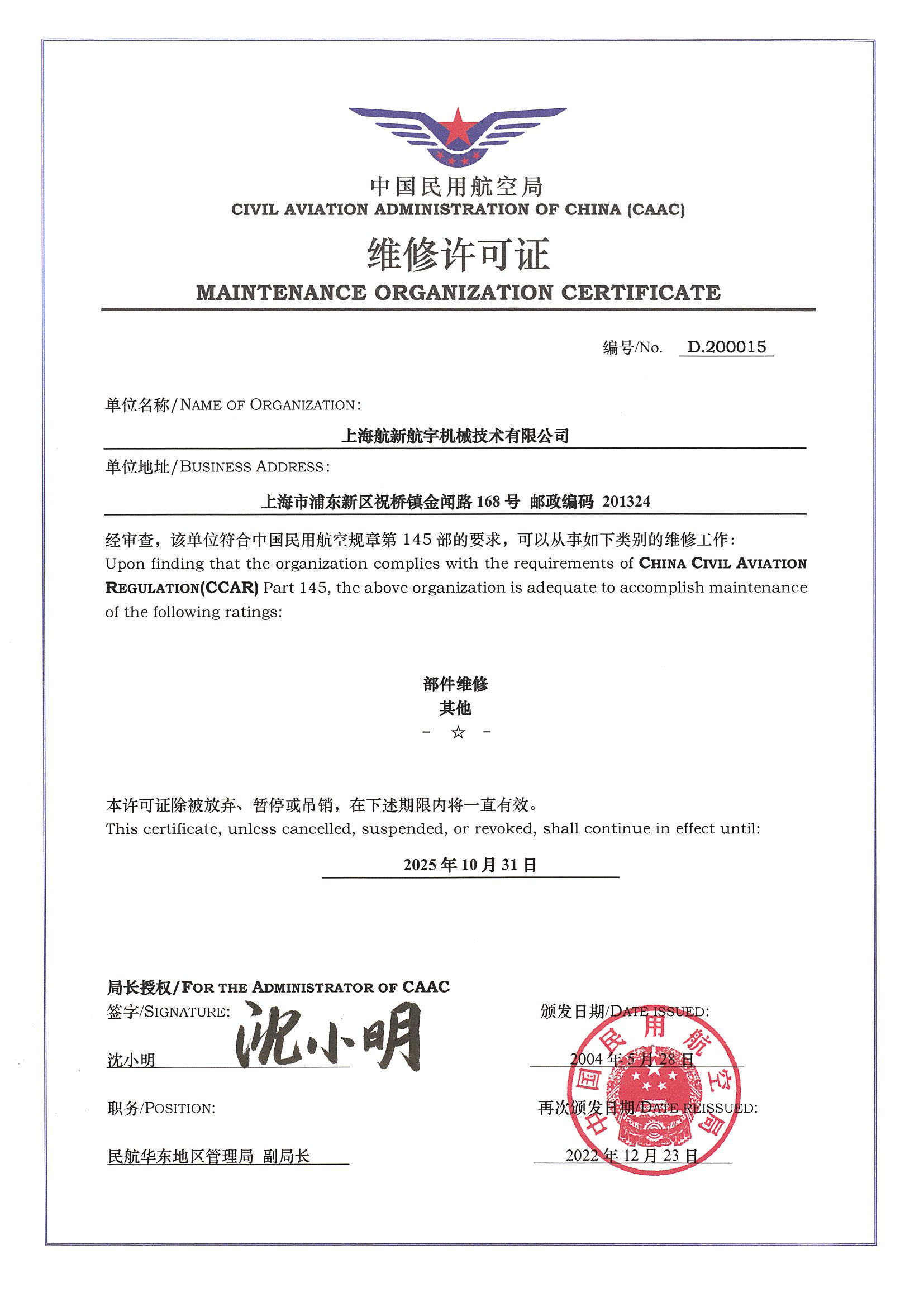 CAAC維修許可證(上海航新)