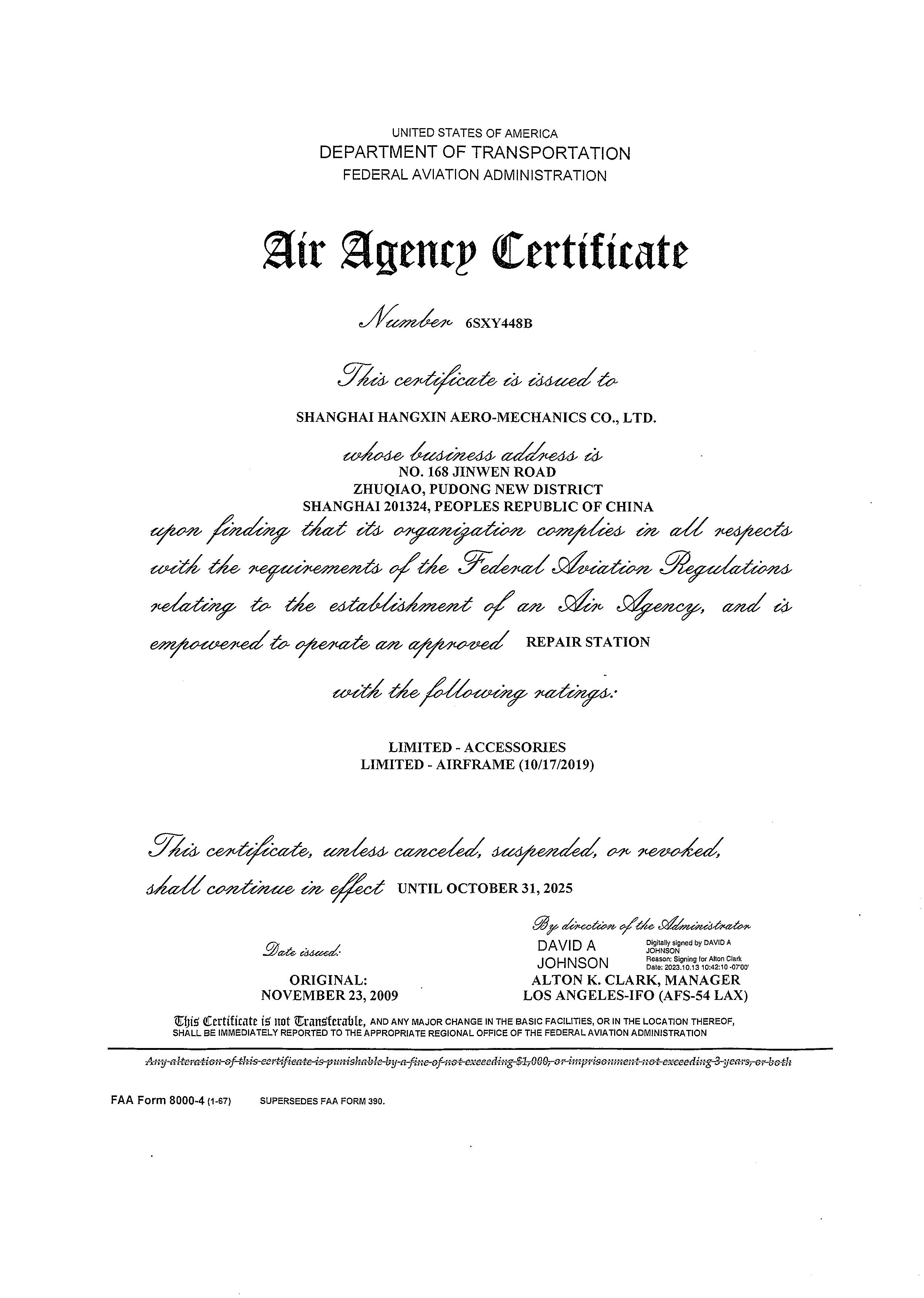 FAA維修許可證(上海航新)