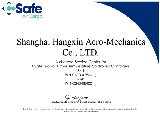 In August 2019, Shanghai Hangxin passed the quality audit of CSafe supplier and became the OEM's exclusive authorized maintenance service center in China. Shanghai Hangxin provides comprehensive maintenance and support services for RAP and RKN airborne temperature-controlled containers produced by CSafe.
